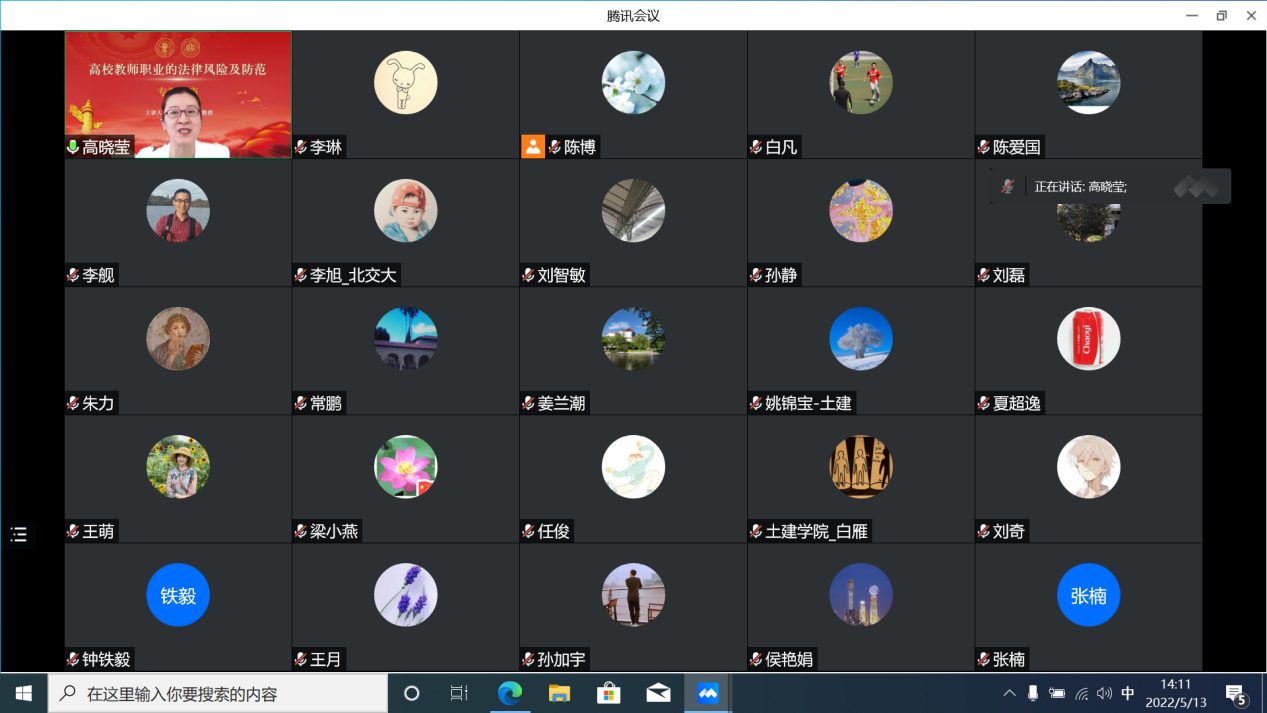 为进一步落实立德树人根本任务,深入推进我院师德师风建设,5月13日下午,土建学院邀请法学院高晓莹教授为我院教师作“高校教师职业的法律风险及防范”师德师风专题讲座。此次讲座以线上形式开展,学院百余人教师参加,会议由土建学院党委副书记陈博主持。