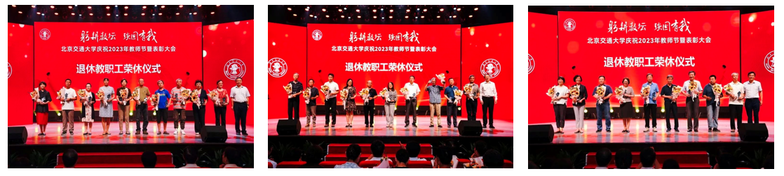 学校为2022-2023年度退休教职工举行温馨隆重的荣休仪式,观看《师者芳华》纪念视频,荣休教职工代表登台接受致敬,校领导为荣休教职工代表颁发纪念章、献花并合影留念。