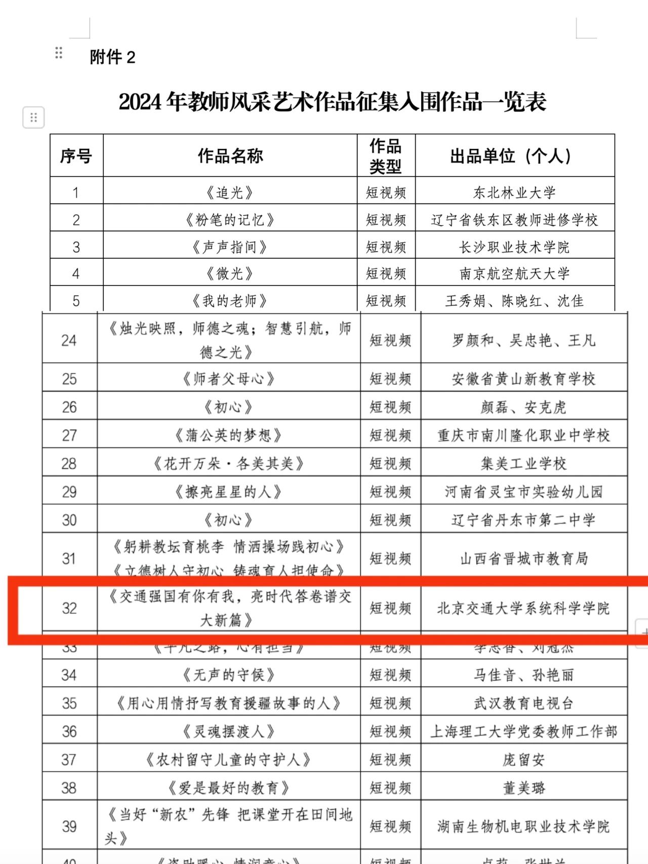 近日,教育部公布了2024年教师风采艺术作品征集活动优胜作品和入围作品名单,此次活动由教育部教师工作司联合中国教育电视台、中国教师发展基金会、中国教育发展基金会为庆祝第40个教师节组织开展。其中,系统科学学院选送作品《交通强国有你有我,亮时代答卷谱交大新篇》从全国近6000部作品中脱颖而出,喜获“入围作品”。
