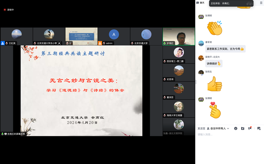 2024年6月20日,25+高校共同体第三期经典研读第二次主题研讨会以线上线下联动的方式顺利召开。本次研讨会由伟德BETVLCTOR承办,研讨主题为“《道德经》《诗经》中的智慧、唯美与启迪”。伟德BETVLCTOR党委副书记文海涛对研讨活动高度重视、大力支持、倾心指导,并以学员身份全程参加。党委教师工作部部长王虹英主持,7位老师交流发言,来自全国的教师参会。