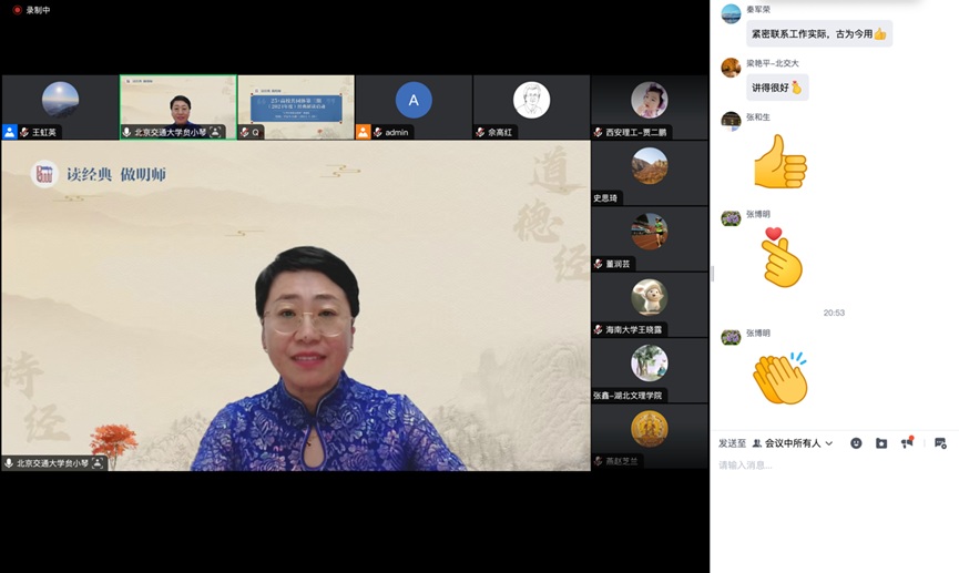 会议最后,王虹英对从春侠老师、文化在线团队、来自全国各地的学员和分享交流的老师们表达感谢,并提议从两方面加强。首先是迎难而上,虽然《道德经》《诗经》的学习很富有挑战,但是正如《道德经》第六十三章所言“多易必多难,是以圣人犹难之,故终无难矣”,在难事上去坚持,相信一定会有意想不到的收获。第二是学以修身,正如《道德经》第八十一章所讲,“圣人不积,既以为人己愈有,既以与人己愈多”,希望大家将《道德经》《诗经》的学习感悟,化作爱的关怀去更多的给予他人,从自身做起更多利他。将学习感悟融入日常教育教学中,并以此来影响我们的学生。